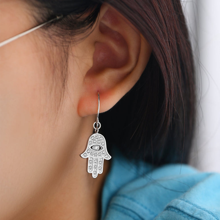 The Hamsa Hand symbol has existed in many cultures for generations as a symbol of protection from evil and as a good luck charm. Our Hamsa Hand earrings would make an amazing gift for yourself, adding a sense of charm and glamour to outfits along with a protective talisman. Made with sterling silver by our talented artisans, this Hamsa Evil Eye earrings feature Hamsa Hand charm bedazzled with brilliant cubic zirconia gemstones.