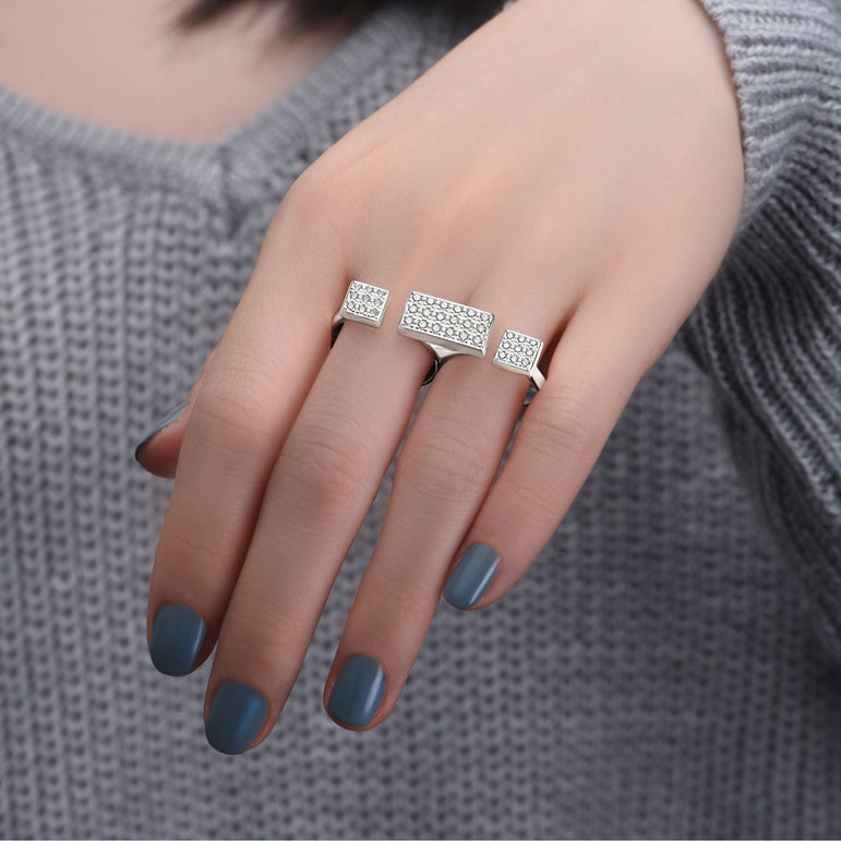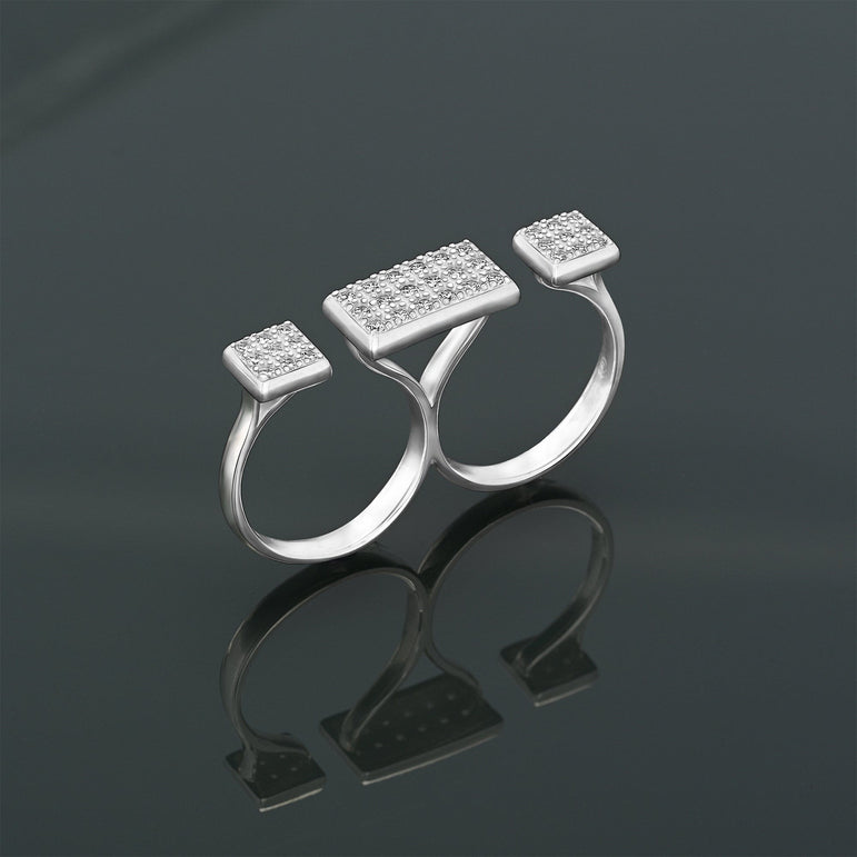 EXQUISITE CRAFTSMANSHIP: Made with 925 sterling silver by our esteemed artisans, this two finger ring features an open top ring band with three square and rectangular paved cubic zirconia bars spanning across two fingers. This sterling silver adjustable ring is available in US ring sizes 6 to 9.