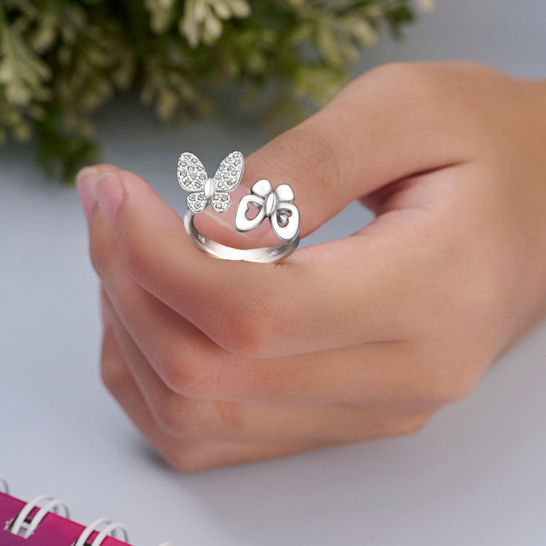 EXQUISITE CRAFTSMANSHIP: Made with 925 sterling silver by our esteemed artisans, this stunning sterling silver ring features an open design adjustable ring band with two butterfly motifs: one plain and another bedazzled with cubic zirconia.