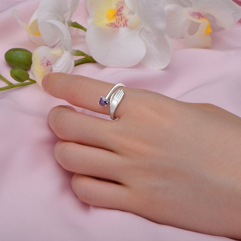INTRICATE CRAFTSMANSHIP: Made with 925 sterling silver by our esteemed artisans, this silver ring features a sleek and adjustable silver ring band with the motif of a hand on one end and a single heart shaped Amethyst stone inlaid on the other end. This sterling silver hug ring is adjustable between US ring sizes 5 to 9.