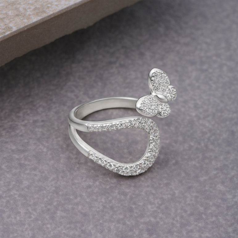REMARKABLE CRAFTSMANSHIP: Made with 925 sterling silver by our esteemed artisans, this stunning sterling silver ring features an open adjustable ring band with a butterfly motif bedazzled with cubic zirconia.